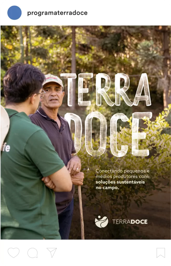 O Instituto Terra lançou em 2023 o Programa Terra Doce como resposta à crise hídrica e à degradação ambiental no Vale do Rio Doce. O desafio era traduzir uma transformação complexa e sensível em uma linguagem que engajasse de pequenos produtores a grandes financiadores.